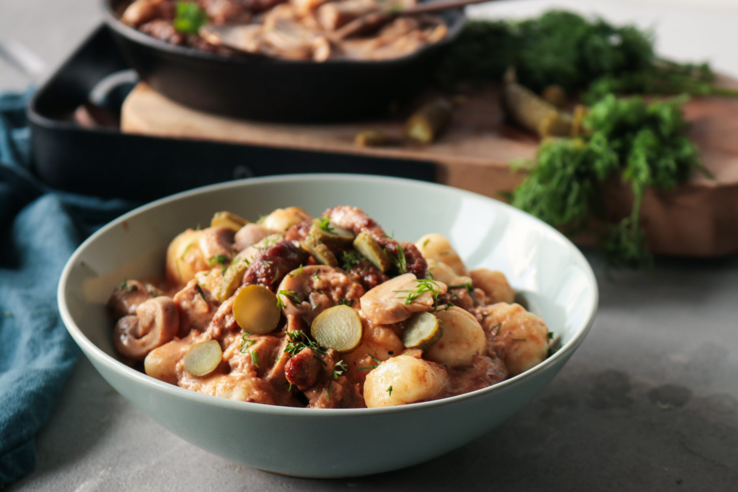 Τέλος προσθέτουμε το μοσχάρι, τον άνηθο, τα αγγουράκια τουρσί και σερβίρουμε με τα νιόκι.